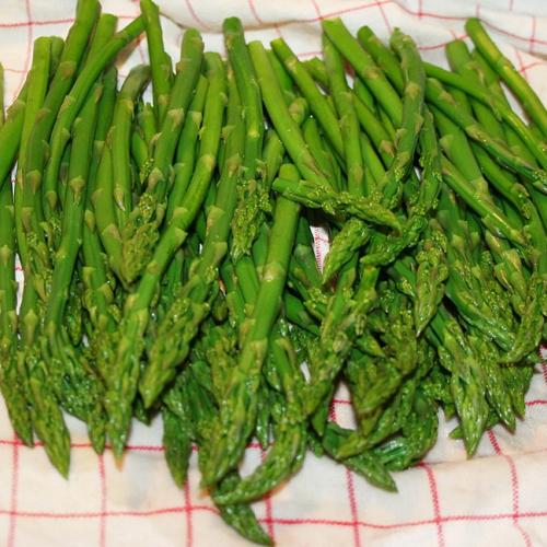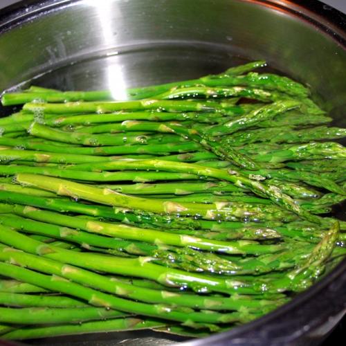 Pripravíme si špargľu. Poodlamujeme tvrdé konce. Ak máme čerstvú špargľu, odlomí sa nám len kúsok, ktorý chrupne sám v tom mieste, kde treba. Mladučkú špargľu nemusíme ani šúpať, staršiu treba. Takto pripravenú špargľu vhodíme do jemne osolenej a osladenej vody povariť asi na tri minúty, aby zmäkla a hneď ju vyberieme a preložíme do ľadovej vody, aby nestratila farbu. Necháme ju na čistej utierke osušiť.