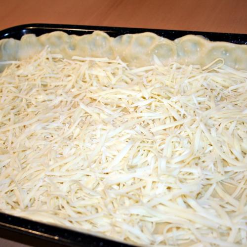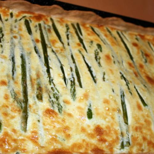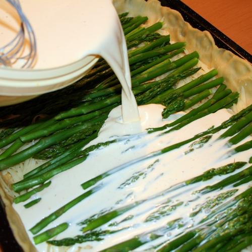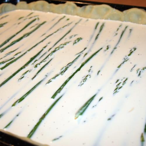 V miske rozmiešame vajcia so soľou, korením, postrúhaným muškátovým orieškom a pomaly prilejeme smotanu s vysokým percentom tuku. Cesto rozvaľkáme a preložíme na pomaslovaný pekáč, alebo zapekaciu misku, či quichovú formu. Okraje cesta prstami povytláčame aj na okraje formy, aby zálievka nevytiekla pod cesto. Cesto popicháme vidličkou a husto zasypeme strúhaným syrom. Rúru predohrejeme na 200 stupňov a na cesto poukladáme osušenú blanšírovanú špargľu.