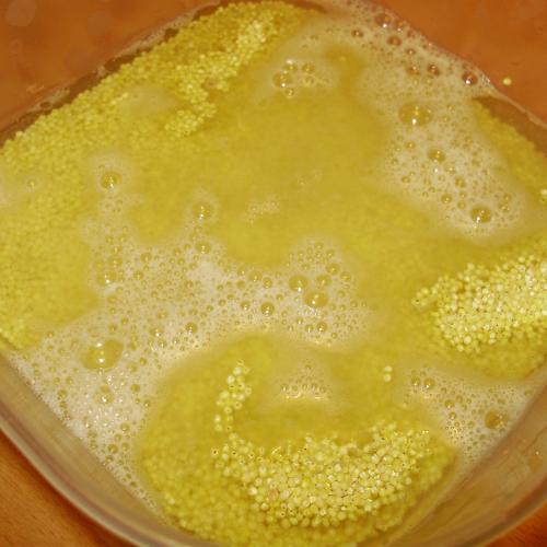 Takto sparené jáhly uvaríme v mlieku so štipkou soli. Ak máte bazlaktózovú diétu, uvarte jáhly v jablkovom mušte. Varíme pomaly a dlho, občas zamiešame. Pomer jáhlí a tekutiny by mal byť 1:4. Keď je jáhlová kaša uvarená, necháme ju trocha vychladnúť, vmiešame do nej maslo, žĺtky a osladíme ju. Môžete medom, alebo cukrom a každý podľa chuti. Pre zdravšiu verziu oslaďte sirupom - agave, javorovým, alebo ryžovým. Ak nemôžete vajíčka, tak ich jednoducho vynechajte. Mám to odskúšané a na chuti to nič neuberie.