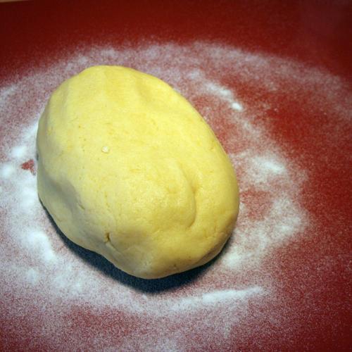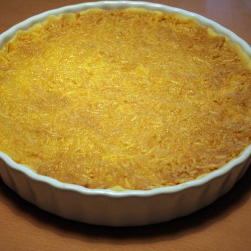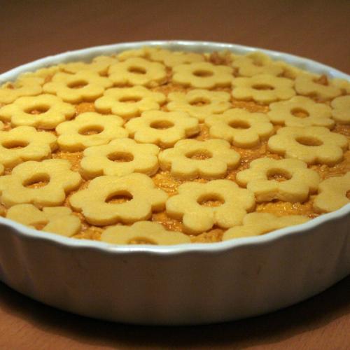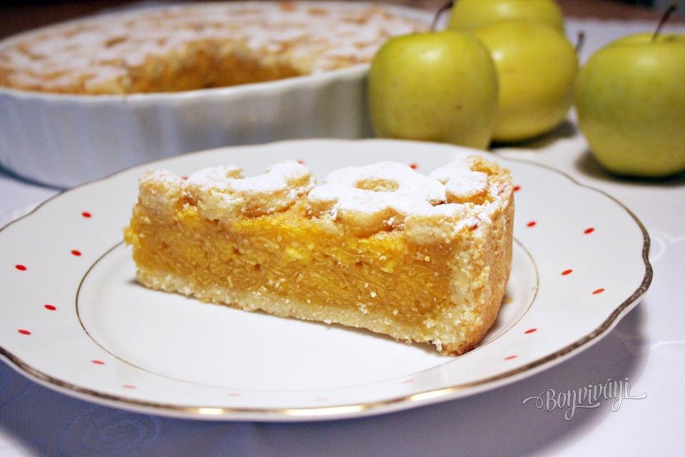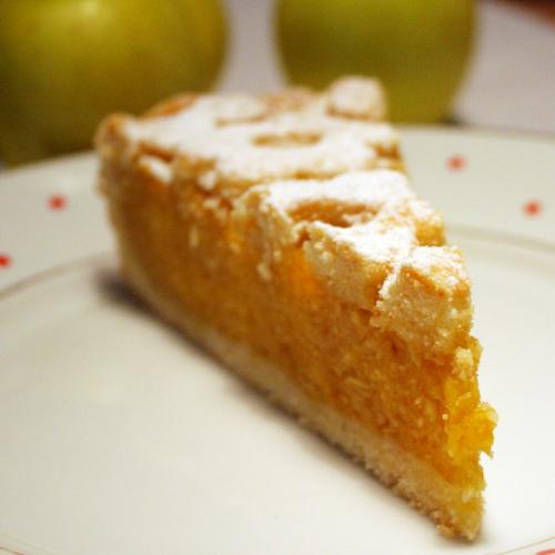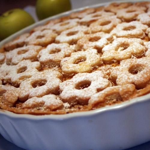Z uvedených surovín na doske spracujeme cesto, ktoré rozdelíme na tri časti. Dve časti opäť spojíme a roztlačíme do formy tak, aby sme vytvorili vysoké okraje. Jablká (asi 1 a 1/2 kila nastrúhaných aj so šťavou) v miske zmiešame s ostatnými surovinami a preložíme do formy na surové cesto.