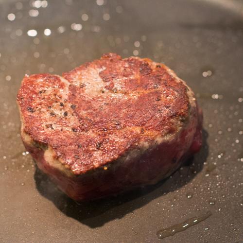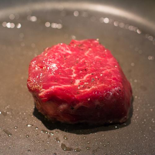 Mäso rozdelíme na 2 rovnaké časti. Každý kus poriadne osolíme a okoreníme. Panvicu rozpálime až sa z nej bude dymyť a pridáme olej. Vložíme steaky, budete počuť krásne syčanie. Ak nemáte dostatočne veľkú panvicu robte steaky radšej postupne. Každý steak musí mať dostatok miesta a panvica musí ostať horúca. Príliš veľa obsahu naraz ju ochladí, čo nechceme.
