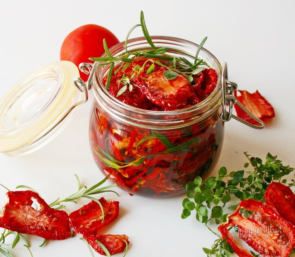Do pohára pokladáme usušené paradajky, preložíme ich bylinkami, pritlačíme a zalejeme olivovým olejom. Pohár vložíme do chladničky a o niekoľko dní budú vhodné na použitie.