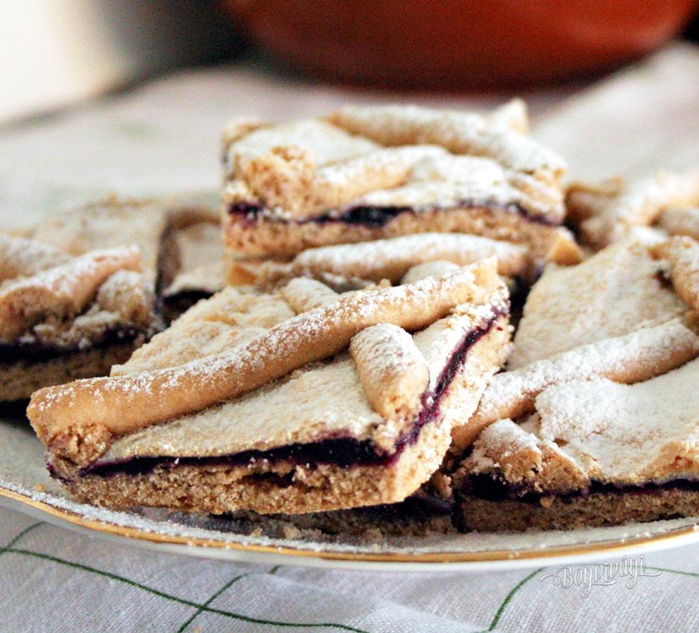 Z uvedených surovín spracujeme hladké lesklé cesto. Na jemne pomúčenej doske ho vyvaľkáme na väčšiu veľkosť, ako je pripravený plech na pečenie 32x40. Cesto opatrne navinieme na pomúčený valček a prenesieme ho na plech, ktorý sme predtým vymastili a vysypali múkou. Nožíkom všetky okraje cesta odrežeme a odložíme. Na cesto natrieme kyslejší džem.