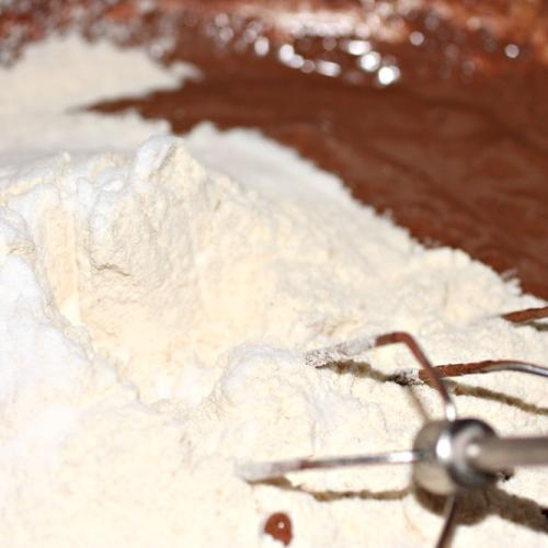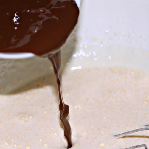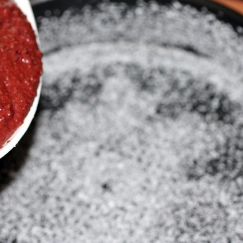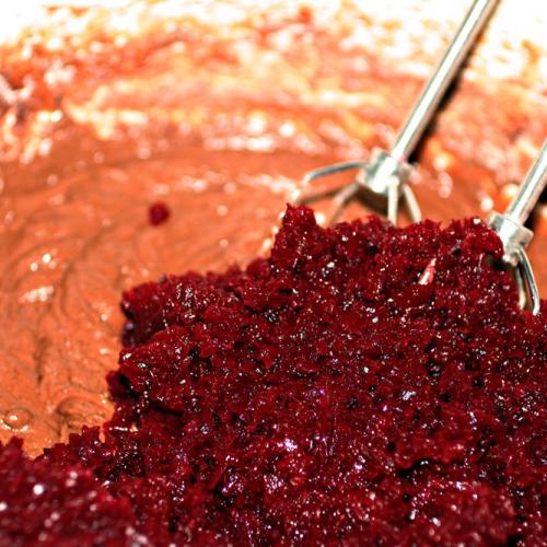 Červenú repu z 0,7 l pohára precedíme a len repu bez šťavy v mixéri rozsekáme na malé kúsky. To by malo byť asi 400 g. Čokoládu a pol deci oleja rozpustíme nad parou (alebo v mikrovlnke) a necháme trocha vychladnúť, aby nebola horúca. Do misky dáme celé vajcia a vyšľaháme ich s trstinovým cukrom do peny. Prilejeme čokoládu, prešľaháme, pridáme múku s jedlou sódou, soľ a kakao a znovu prešľaháme. Pridáme posekanú repu a primiešame ju do zmesi. Potom prilejeme mlieko a kokosový olej (môžete aj obyčajný), už len metličkou primiešame. Hmota je redšej konzistencie.