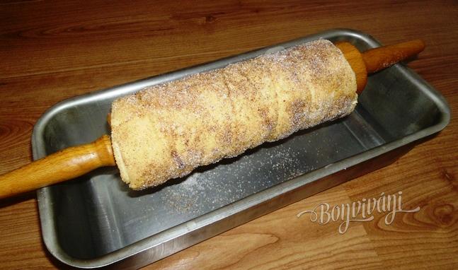 Takto pripravený valček s trdelníkom potrieme dobre maslom a obalíme v cukre s vanilkou a škoricou, alebo v orechoch. Valčekom otáčame a tým cesto celé obalíme.