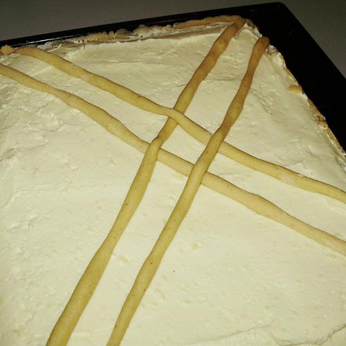 Z mlieka, cukru a pudingových práškov uvaríme hustú kašu a necháme vychladnúť. V miske vymiešame vanilkový cukor s maslom a tvarohom a podľa chuti pristrúhame citrónovú kôru. Túto plnku rozotrieme na cesto.