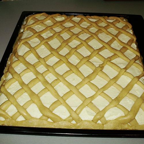 Z uvedených surovín spracujeme jemné cesto. Jednu polovicu rozvaľkáme, preložíme na plech a dotvarujeme valčekom.