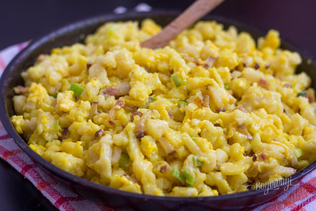 Toto zvykol robit moj nebohy ocino, ale zo zemiakovych halusiek (ked sme robili bryndzove, alebo strapacky, cast cistych halusiek sa odkladala bokom a mali sme na druhy den na ranajky vajcove).