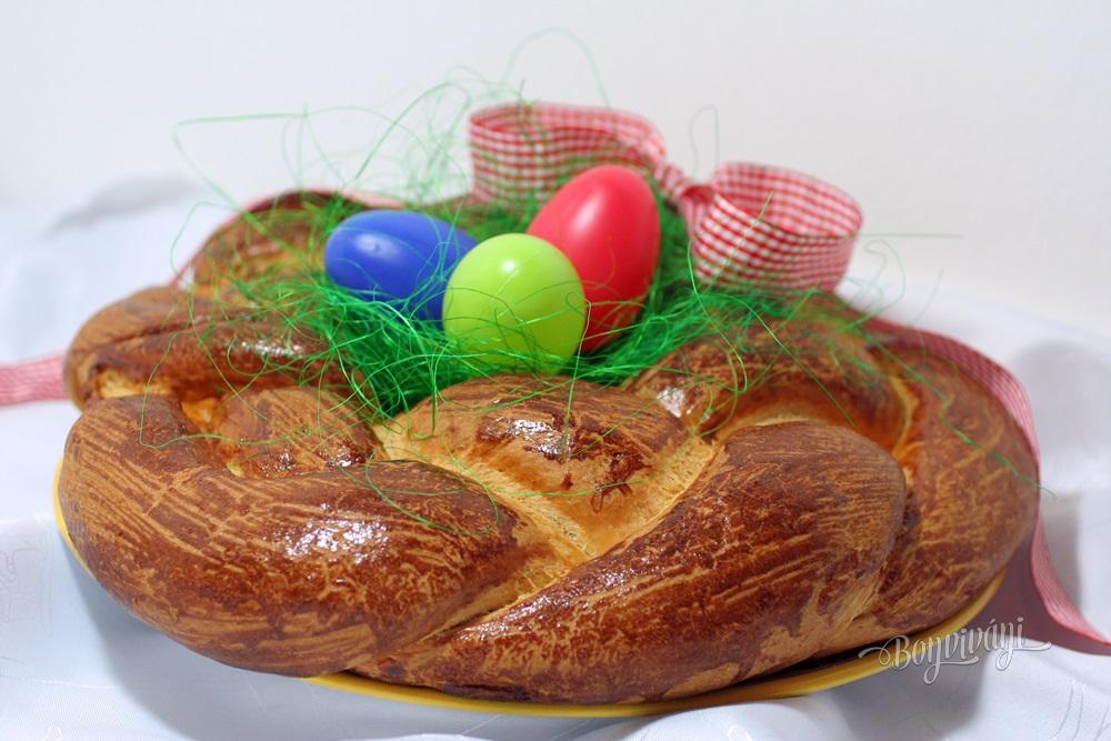 Zapletieme obyčajný vrkoč, na veľký plech dáme papier a do stredu pohár z hrubého skla, aby v rúre nepraskol. Môže byť aj pohár na zaváranie. Okolo pohára položíme vrkoč a oba konce spletieme, aby sa nerozliezli. Potrieme zvyškom masla a dáme ešte nakysnúť. Keď veniec podkysne - zväčší objem, potrieme ho rozšľahaným vajcom a vložíme do rozohriatej rúry na 180 stupňov.