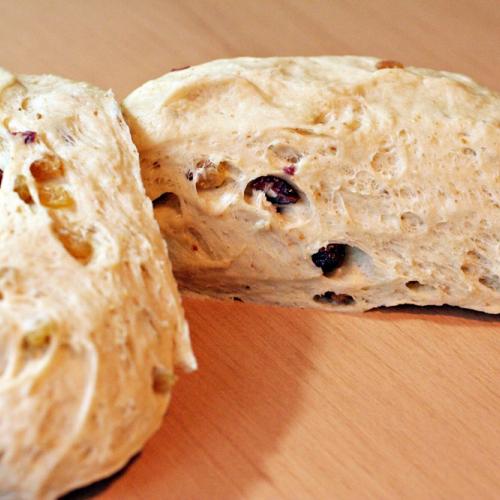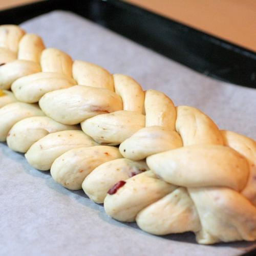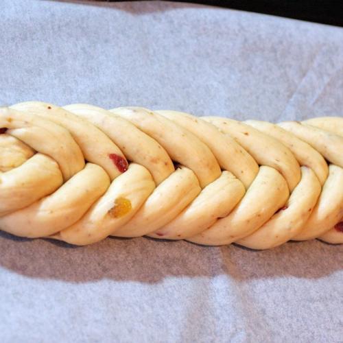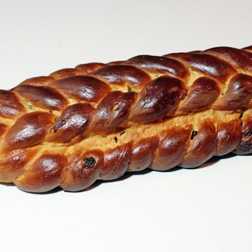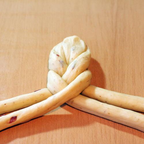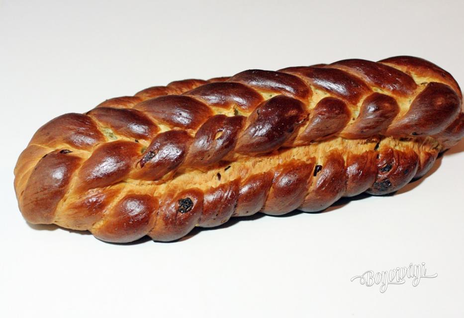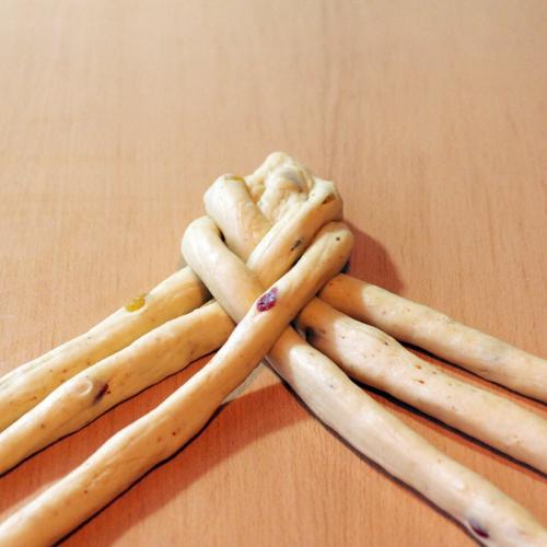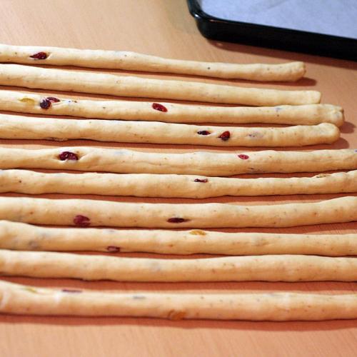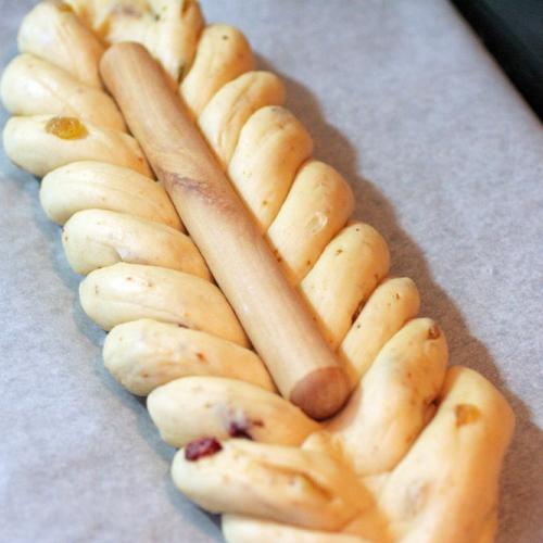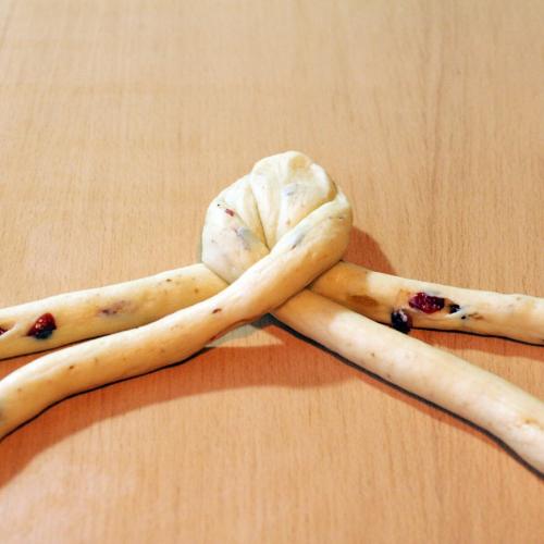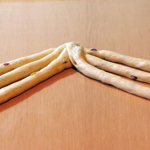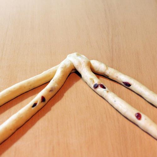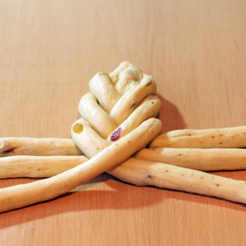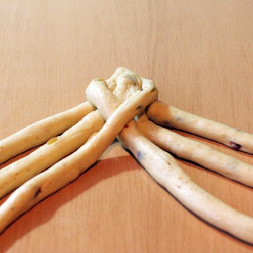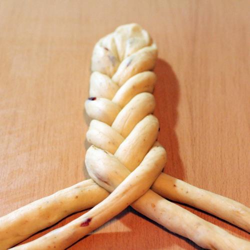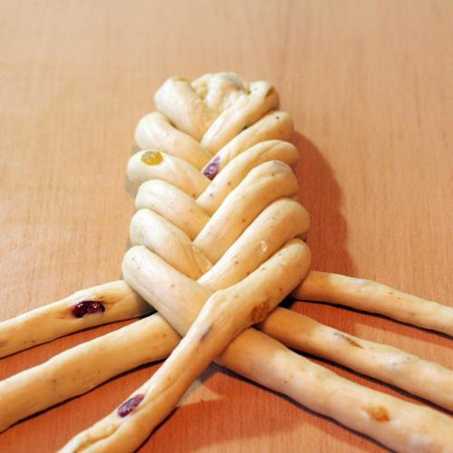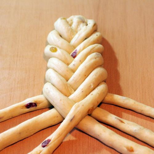 Do väčšej misky nasypeme múku so soľou, v strede vyhĺbime jamku, vlejeme do nej hrnček vlažného mlieka a nasypeme cukor. Do mlieka rozmrvíme čerstvé droždie. Pridáme dve žĺtka, mäkké maslo, vanilkový cukor, nastrúhame kôru z citróna (môžeme aj z pomaranča) a všetko spolu premiešame. Po chvíli spracujeme pekné nelepivé cesto. Do cesta vpracujeme hrozienka (môžeme aj brusnice), znovu premiesime, poprášime múkou, zakryjeme utierkou a necháme vykysnúť. Vykysnuté cesto vyklopíme a rozdelíme na 10 častí. Z každej časti dlaňami vyšúľame pramene dlhé asi 60 cm.