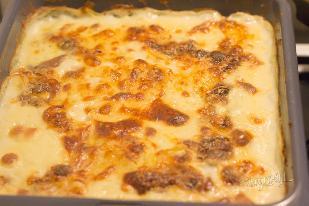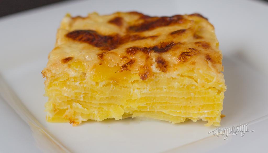 Celý obsah hrnca vylejeme na veľký hlbší plech a dobre pritlačíme. Dáme piecť do vyhriatej trúby na 200 stupňov. Po 15 minútach prisypeme na vrch strúhaný syr (výraznejšieho typu - parmezán, grana padano, čedar) a znovu dobre pritlačíme. Pečieme ďalších 20 minút. Po upečení necháme krátko vychladnúť, aby zemiaky držali pekne kompaktne spolu.