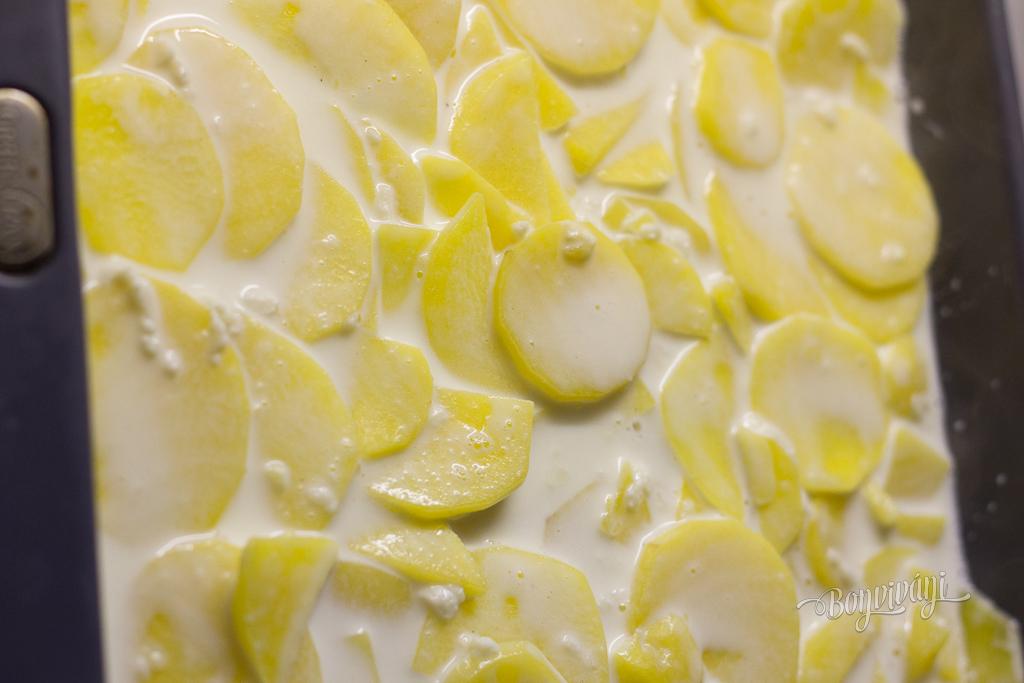 Zemiaky (varný typ A) nakrájame na asi 2 mm tenké plátky. Mlieko (plnotučné) s ostatnými surovinami okrem syra privedieme v hrnci k varu. Povaríme v ňom zemiaky za občasného miešania asi 2 až 3 minúty. Môžeme pridať aj rôzne bylinky. Výborne sa hodí rozmarín. Ak chystáte zemiaky ako prílohu k rybe, skúste citrónový tymián.