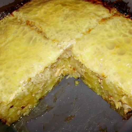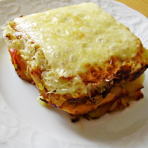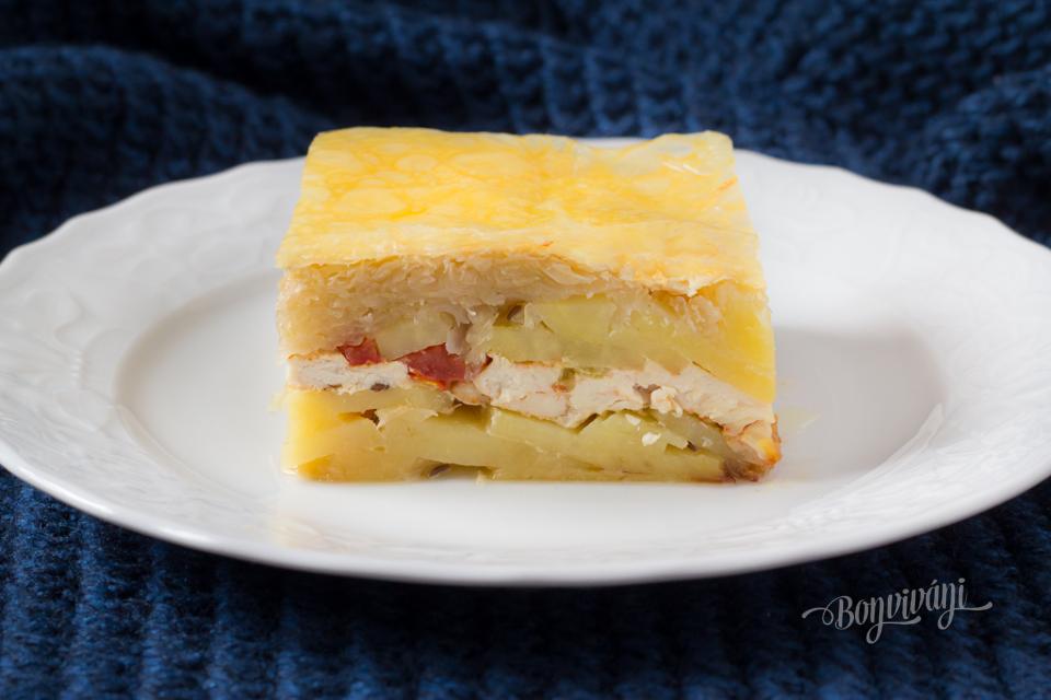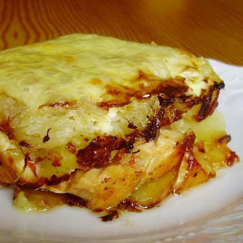Je to jeden z lacnejších receptov, taký predvýplatový. Práve preto je obľúbený a každý kto ho robí, improvizuje podľa toho, čo práve doma má a na čo má chuť. Základom sú však vždy zemiaky, kvasená kapusta a nejaké mäso. Často používam mleté bravčové, no dnes som zapekala s kuracími prsíčkami. Mala som ich pokrájané na rezančeky pripravené na niečo iné, no zapekané zemiaky dostali prednosť.
