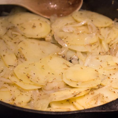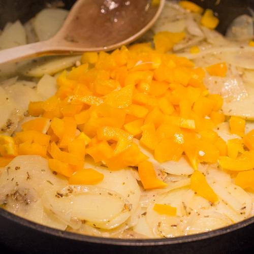 V tomto recepte sú vo frittate zemiaky, cibuľa, žltá paprika na osvieženie a dva druhy syra. Rozpis je na 6 porcií.