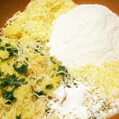 Tentokrát na slano. Výborné teplé predjedlo, alebo aj hlavný chod. Prísady k zemiakom často obmieňam. Niekedy dám šunku, inokedy slaninku, alebo viac zeleniny. Vždy v rovnakom pomere. Dnes som vyskúšala bezmäsitú variantu s pridaním syra do cesta. Ak vám niekedy ostanú varené zemiaky, určite vyskúšajte.