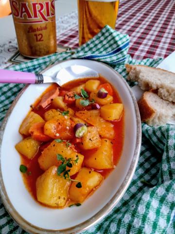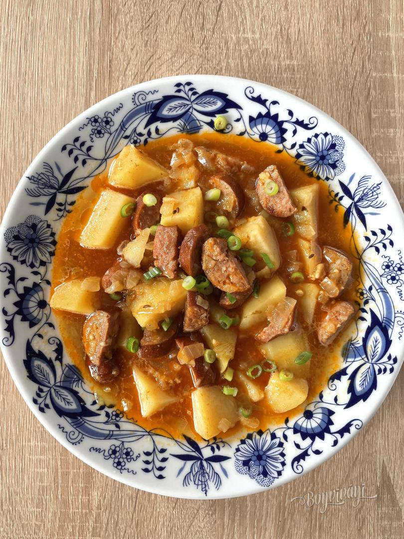 Zemiakový guláš (buřtguláš) je ideálny recept, keď neviete, čo variť, času je príliš málo a do výplaty ďaleko :) Je trochu ošidený, ale aj oveľa rýchlejší, než guláš klasický. Náhradou za mäso sú v ňom použité zemiaky a kus lepšej točenej salámy, klobásy, párkov, či špekáčikov.
