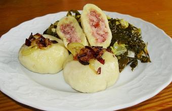Guľky a knedľa zo zemiakového cesta, plnená údeným mäsom, preliata opečenou cibuľkou. Prílohu som tentokrát zvolila mladú novú kapustu…