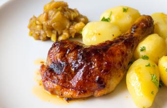 Kuracie stehná jemne potierané medovou marinádou nie sú až tak sladké, ako by sa zdalo. Hruškového čatní je zase ostro-kyslo-sladké.…