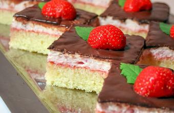 Jednoduché šťavnaté rezy s čerstvými jahodami v kréme, poliate kakaovou polevou. Je to vlastne jahodová variácia na…