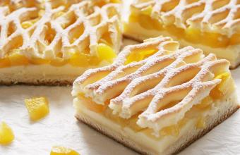 Pudingová plnka s kúskami broskýň na obľúbenom kysnutom ceste s efektnou mriežkou na vrchu.