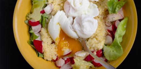 Ryžovo-polentový šalát s pošírovaným vajcom
