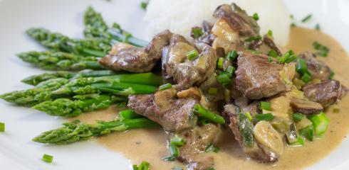 Lesné huby, mäkké mäsko a koňakovo-smotanová omáčka. V kombinácii s mladou chrumkavou špargľou je to výborná pochúťka.