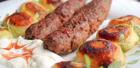 Pripravené z mletého bravčového mäsa, podávané s pečenými novými zemiakmi...