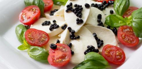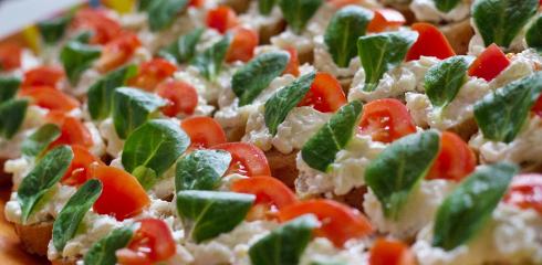 Rýchle pohostenie - tmavé celozrnné bagetky so syrovým šalátom, jemne ozdobené rajčinou a poľníčkom.