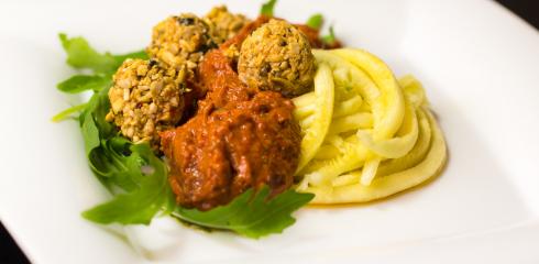 Cuketové špagety s rajčinovou omáčkou a orieškovo-semienkovými guľôčkami